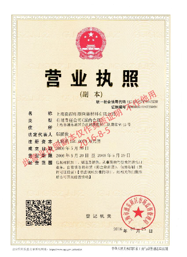 上海奕程印刷包裝材料有限公司 地址:上海浦東新區華夏東路4220號